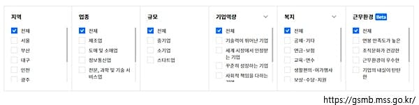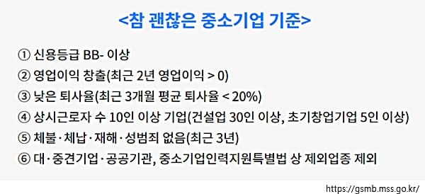 우수 기업 중 6개 기준에 충족한 3만 개 우수 중소기업 일자리를 찾을 수 있다. 6개 기준은 신용등급, 영업이익 창출, 퇴사율, 체불 및 체납 이력, 중소기업 인력지원 특별법 상 제외업종 그리고 10인 이상 기업이다.